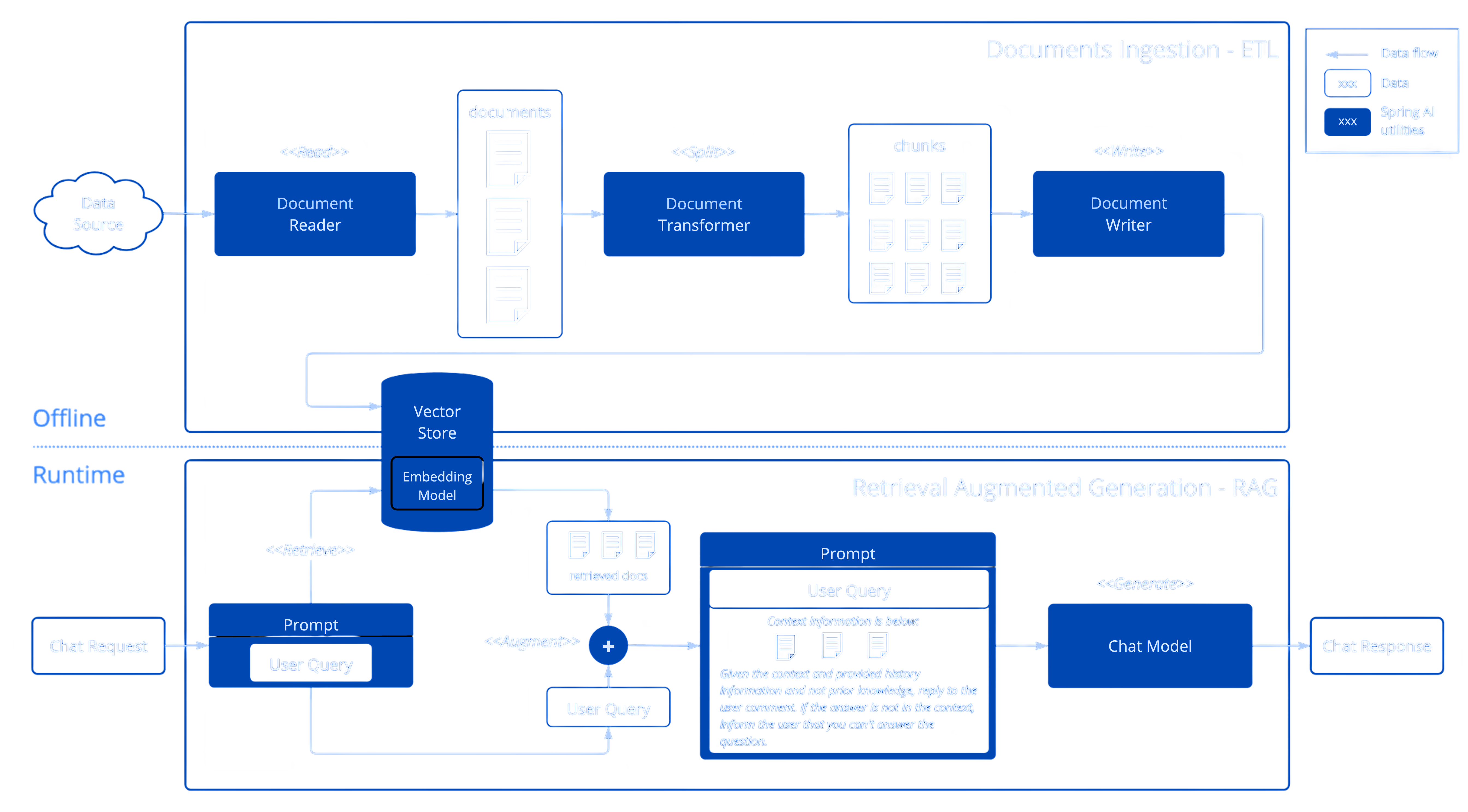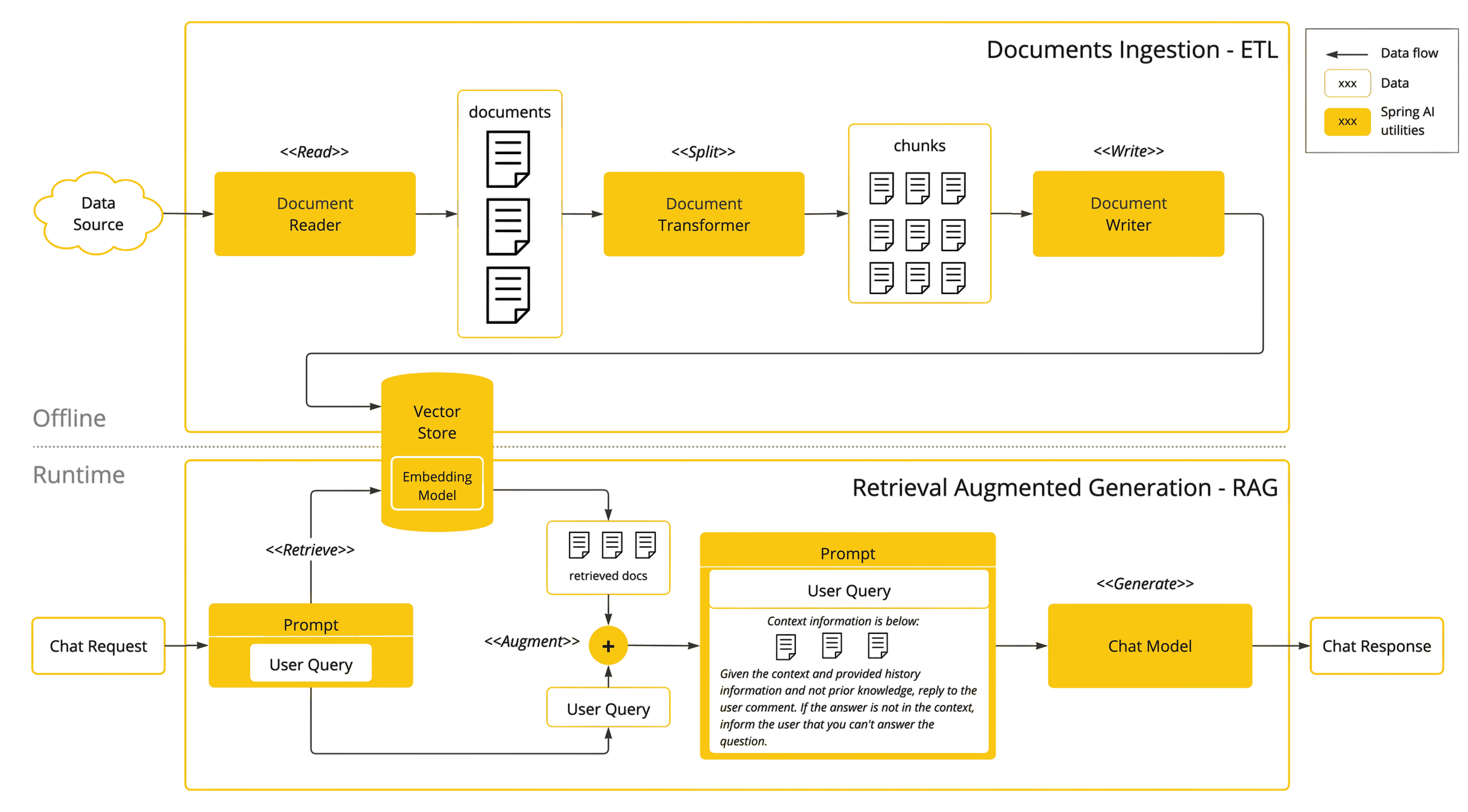 At its core, Spring AI addresses the fundamental challenge of AI integration - Connecting your enterprise Data and APIs with the AI Models. A technique termed Retrieval Augmented Generation (RAG) has emerged to address the challenge of incorporating relevant data into prompts for accurate AI model responses.Spring AI greatly simplifies code you need to write to support RAG pipelines.