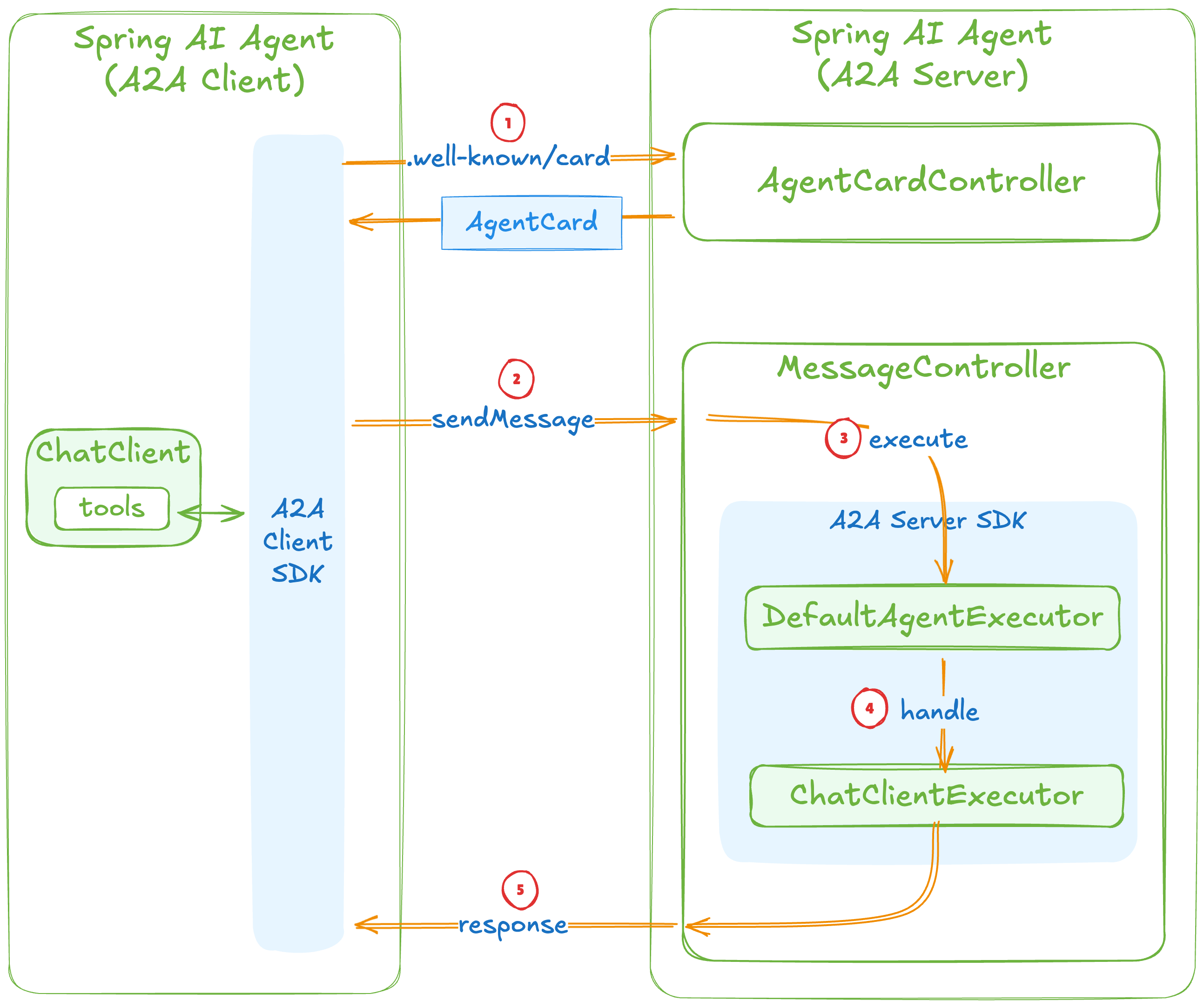 ChatClient and toolsDefaultAgentExecutor that bridges A2A SDK and Spring AIHere's what the integration handles for you:
