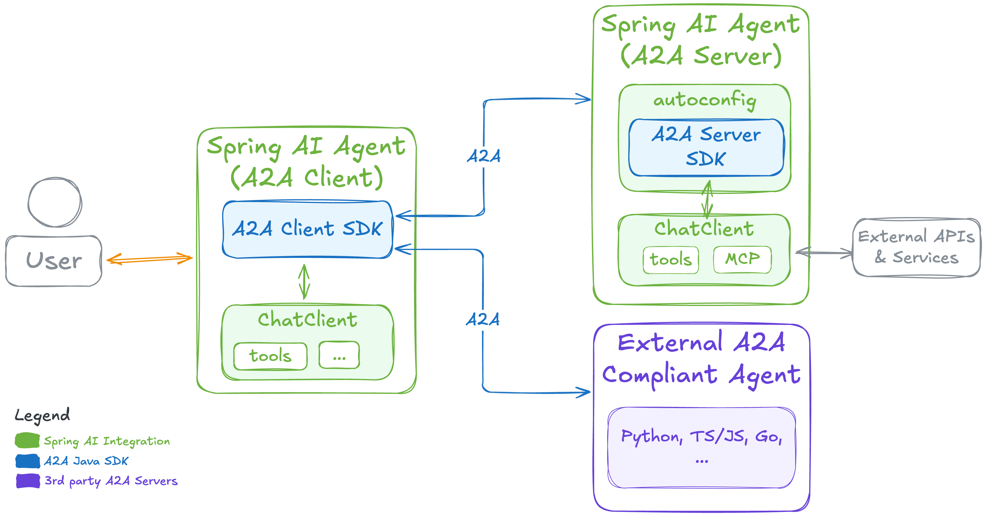 While the A2A Java SDK provides the protocol implementation, integrating it with Spring AI requires additional plumbing. This is where the Spring AI A2A project comes in.